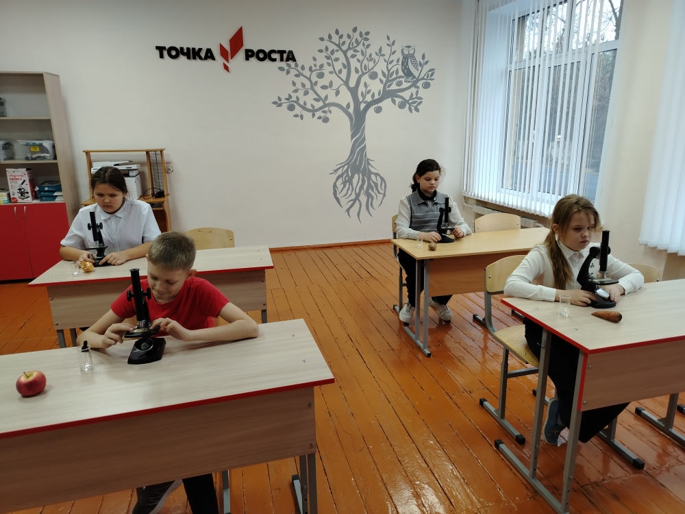 в Центре «Точка роста» под руководством учителя химии и биологии Борзенковой В. А. учащиеся изучили лабораторное оборудование и приборы для исследований. Познакомились с историей изобретения микроскопа, его устройством и правилами работы, техникой приготовления временного микропрепарата.